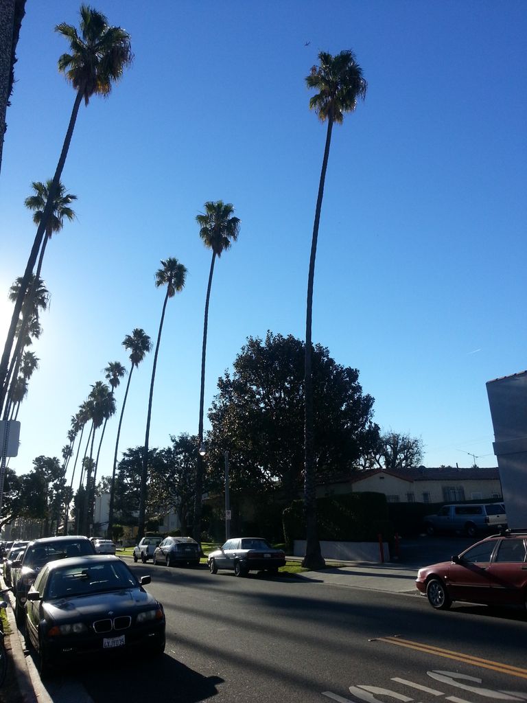 I headed down Montana until I hit the beach. Santa Monica Beach is a beautiful sprawl of white sand, tall palm trees, and highway. With the pier in my sights, I turned left and walked down Ocean Ave toward the 3rd Street Promenade. I found the promenade (three blocks, on 3rd street, natch, between Wilshire and Santa Monica Blvds, of shops and restaurants) and moseyed around looking for breakfast. Long after my growling stomach demanded, I settled in to a little bakery with a pretzel croissant breakfast sandwich and a vanilla latte to send emails and read the post Golden Globes roundup.