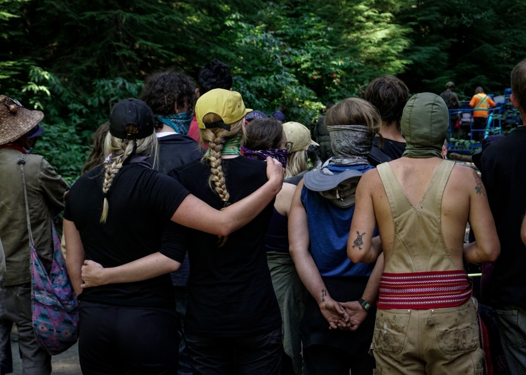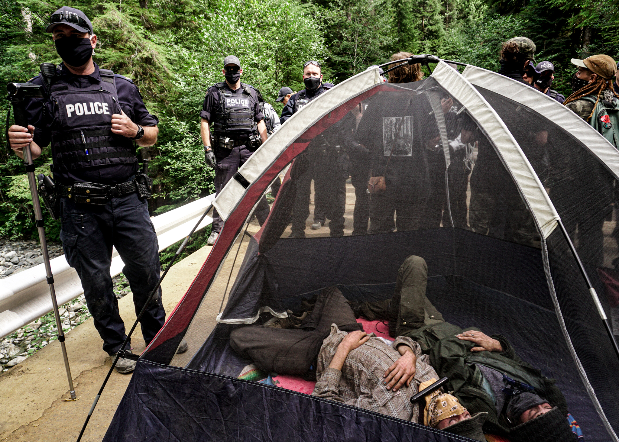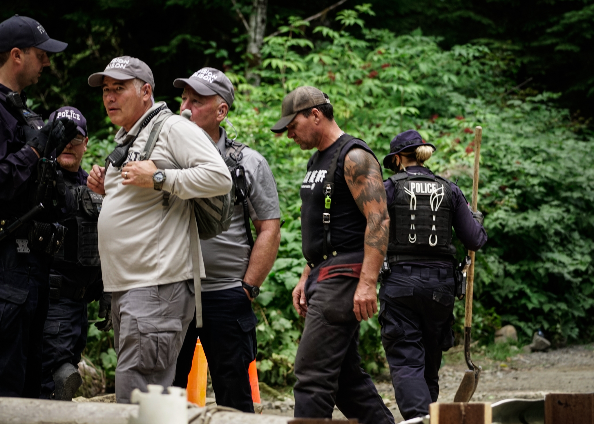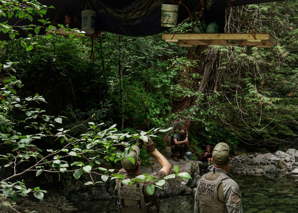 Forest defenders hold off the RCMP and Teal Jones industry workers.