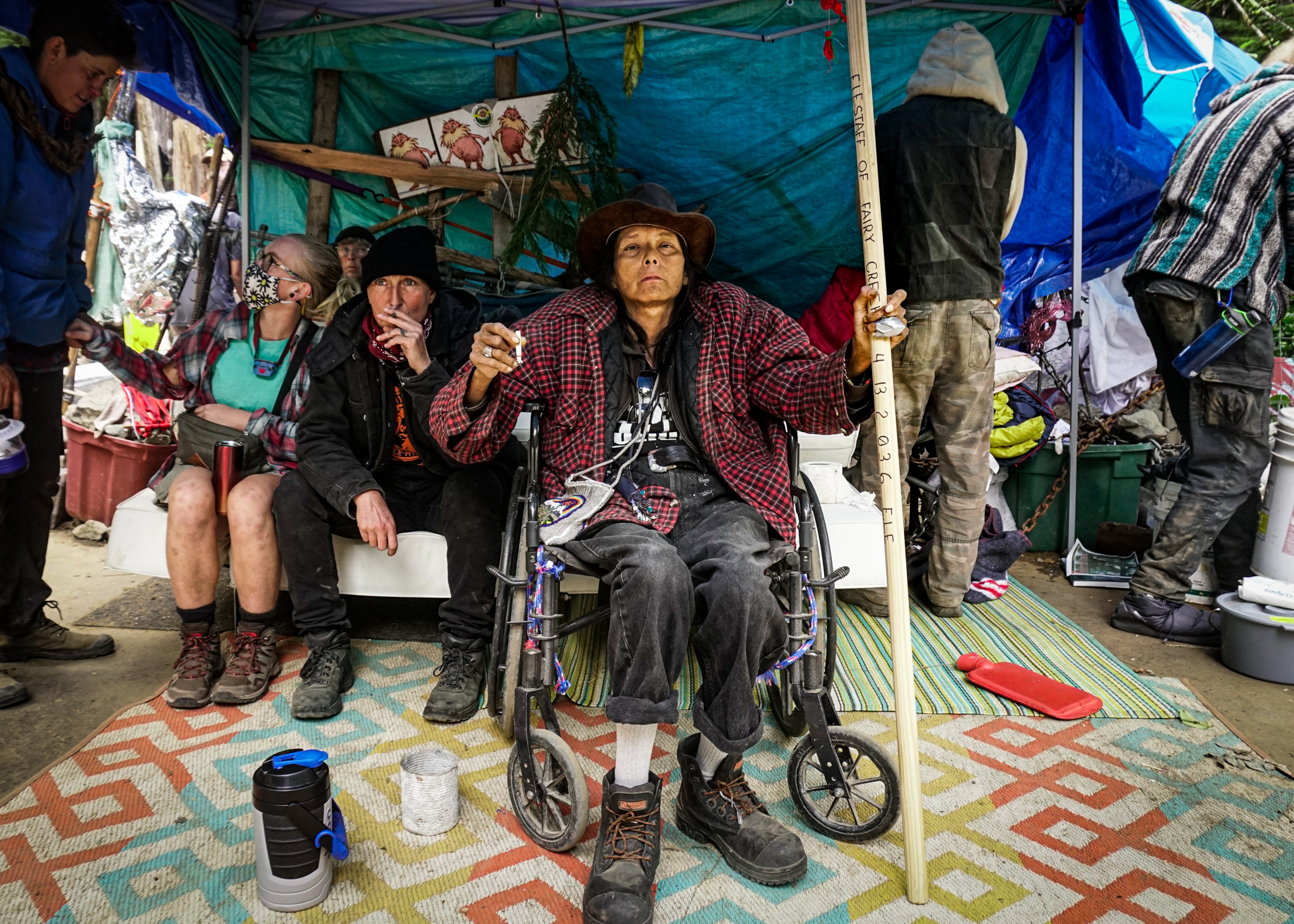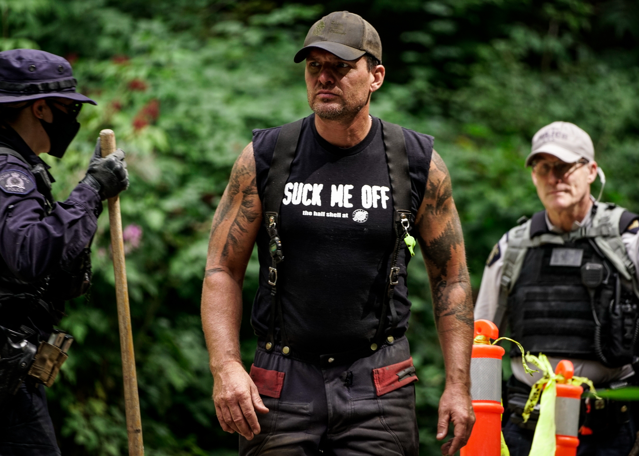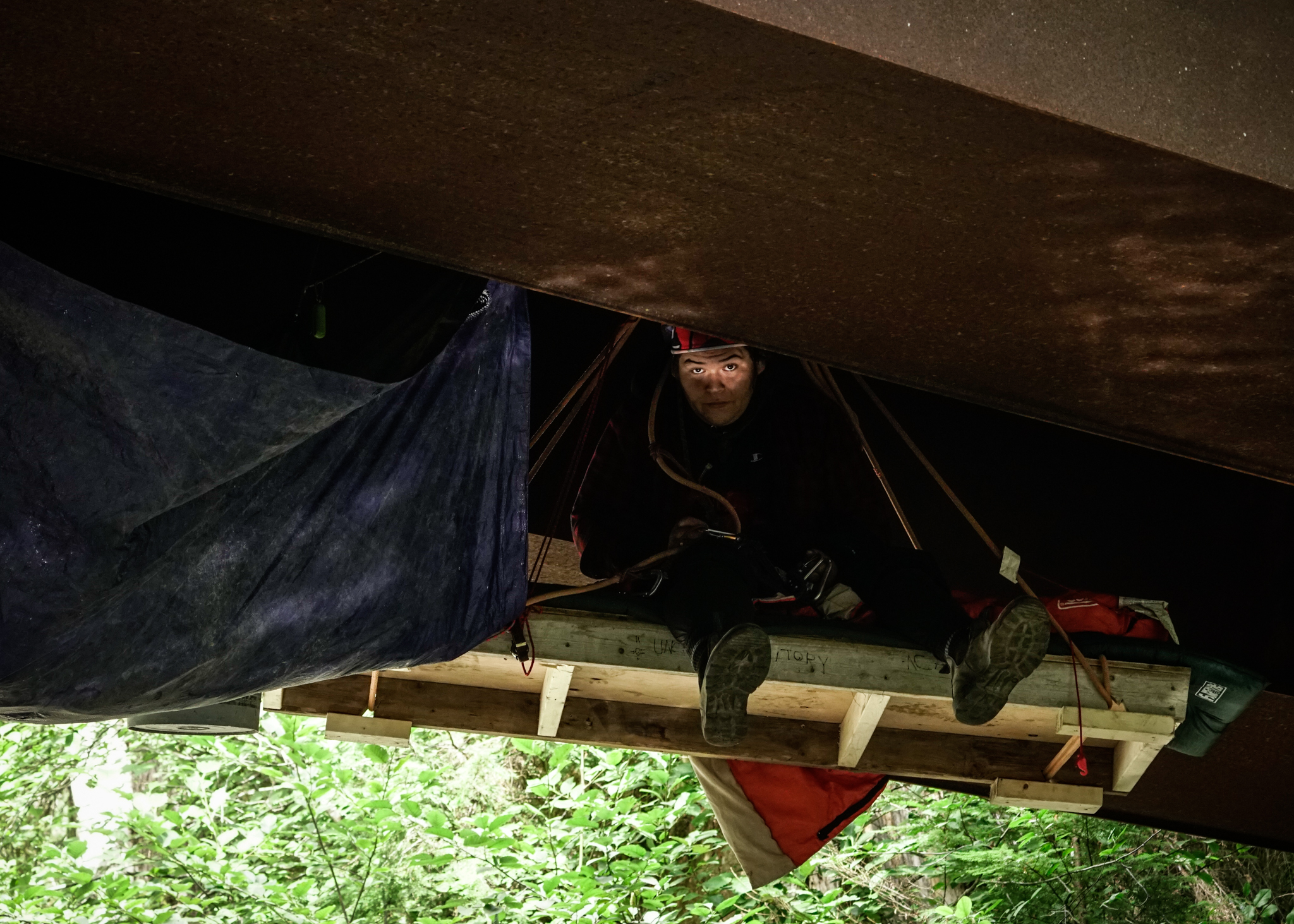 Forest defenders hold off the RCMP and Teal Jones industry workers.